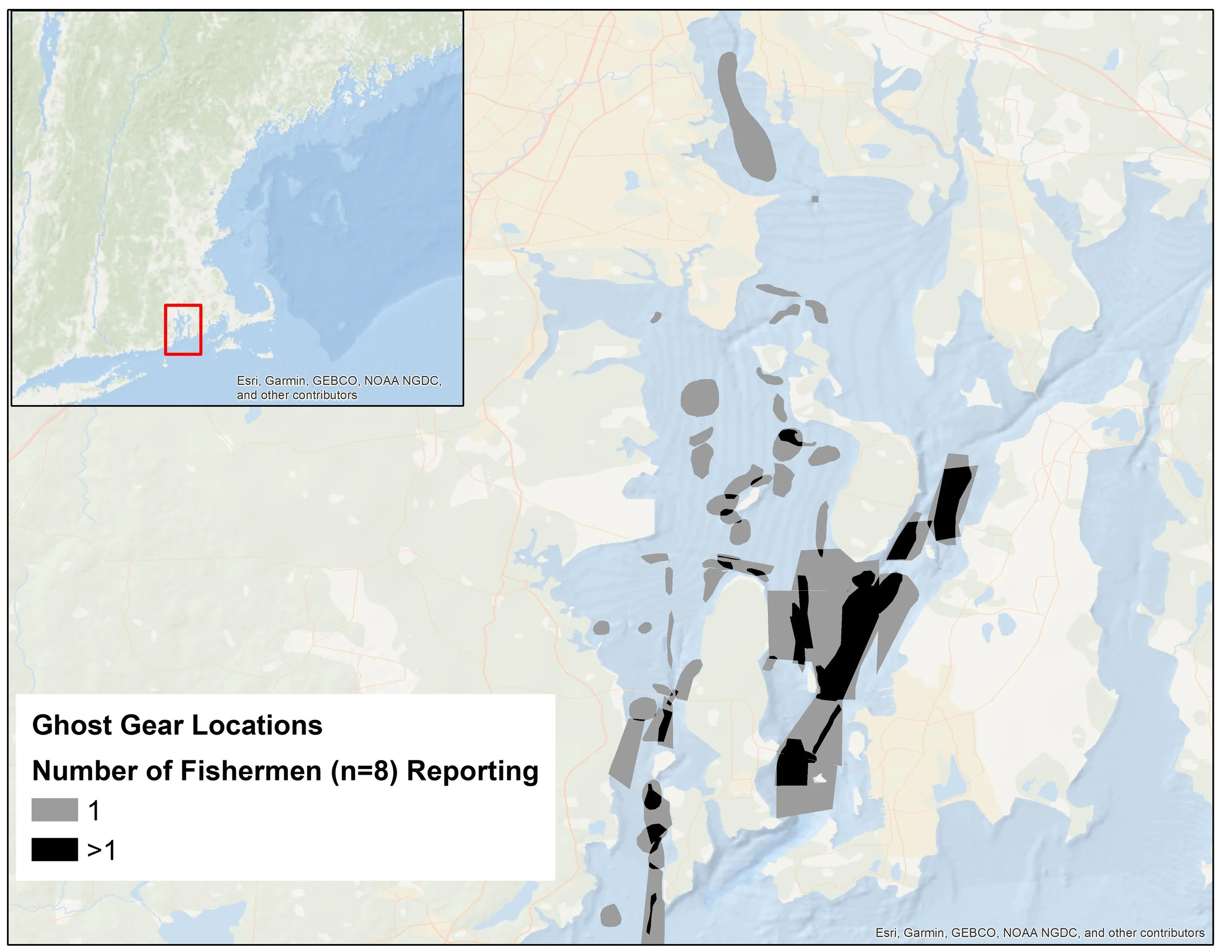 Ghost gear locations in Narragansett Bay from interviews with seven fishermen. The black areas are where more than one fisherman identified it as an area with ghost gear.