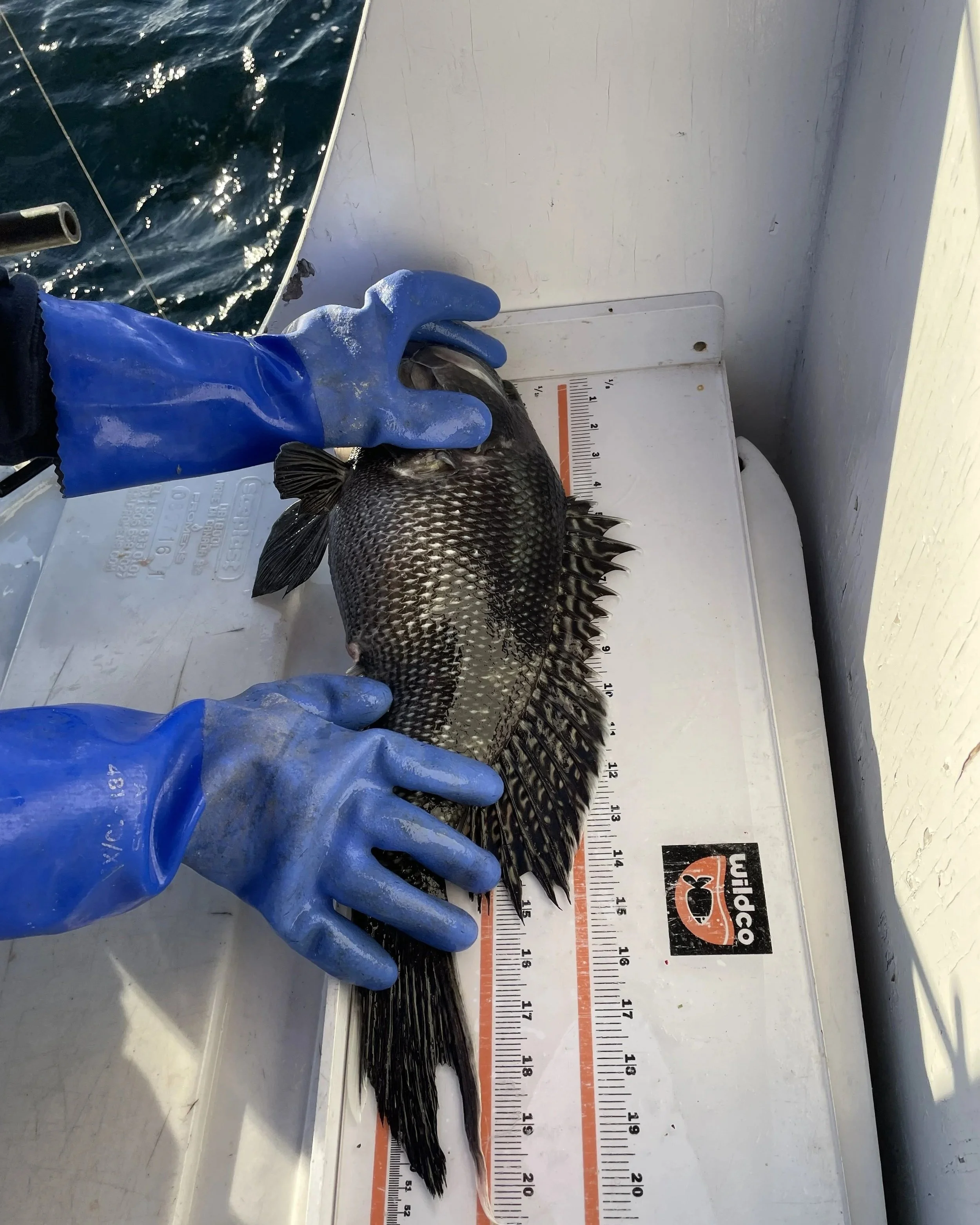 A Black Sea Bass (Centropristis striata) caught on a jig line.
