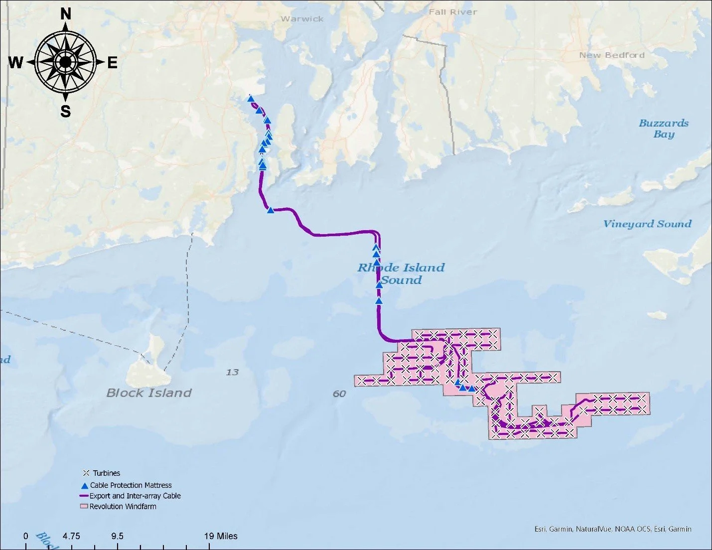 The burial of submarine cables associated with offshore wind development is the standard best practice to reduce entanglement, gear loss, and damage hazards from commercial fishing operations. In areas where seafloor conditions or other factors don’t allow for cable burial, cable protection measures such as concrete mattresses are used instead. Concrete protection mattresses have been extensively installed along windfarm cable export routes in southern New England, despite limited data regarding the interaction between commercial fishing operations and these mattress structures.